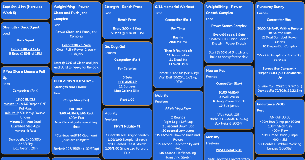 This week emphasizes repeatable strength under fatigue, aerobic intensity, and gymnastics progression—all while honoring key moments, such as Thursday’s 9/11 Memorial Workout. Monday kicks off with squat strength work with 5s at 80% before flowing into a full body strength EMOM. Tuesday builds into heavy clean and jerks followed by fast running and barbell cycling in the interval-based “Strength and Honor.” Midweek focuses on speed and upper body strength, blending bench press with fast burpee-bike intervals. Thursday invites a sense of reverence and resilience through the 9/11 memorial workout, pushing athletes to stay composed. Friday highlights barbell cycling and overhead stamina with snatch work and wall walks. The weekend features a demanding partner effort in “Runaway Bunny.” Expect to see strength benchmarks, stamina-focused EMOMs, high skill gymnastics touches, and conditioning built around pacing, control, and grit.