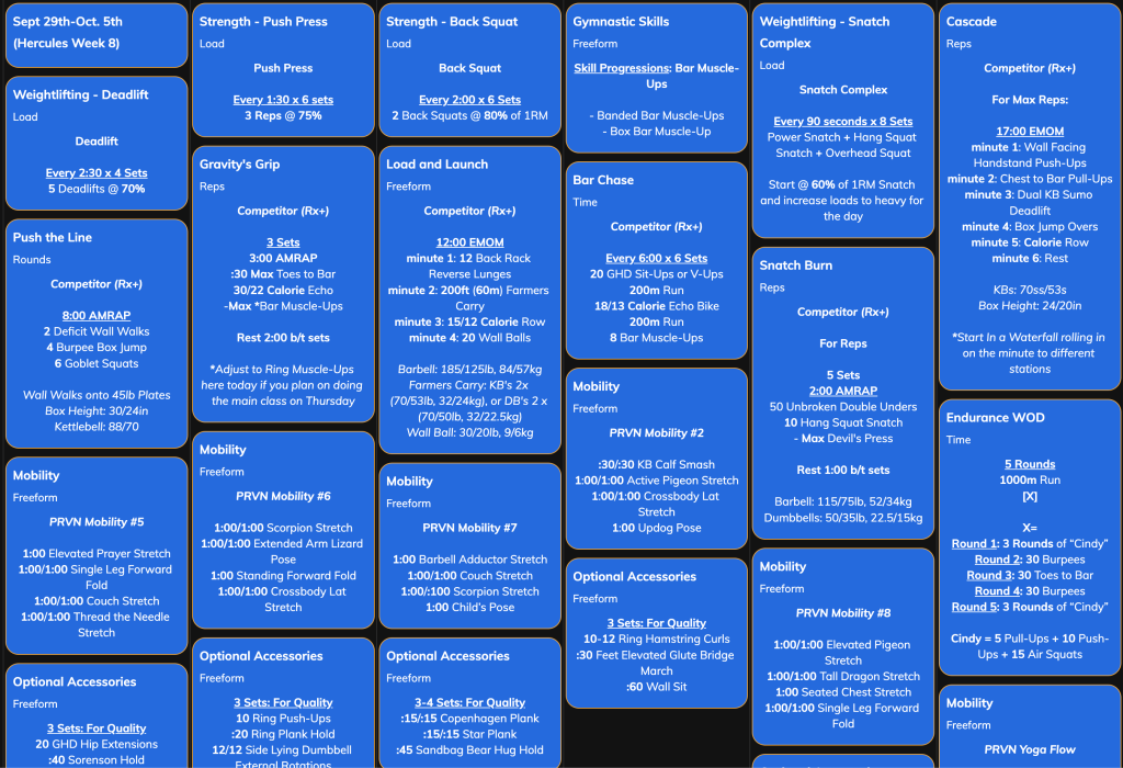 This week balances high-quality strength work with varied conditioning pieces that push stamina, midline strength, and gymnastics skill. Expect a steady wave of barbell loading (Deadlift, Push Press, Back Squat, Bench Press) alongside skill-dense metcons (wall walks, bar muscle-ups, strict pulling). Athletes will see a mix of intervals, EMOMs, and short AMRAPs—perfect for refining pacing and improving capacity before we head toward October testing. This is not a true deload style week, but we are doing just enough to taper things off and prime the system going into our testing phase.